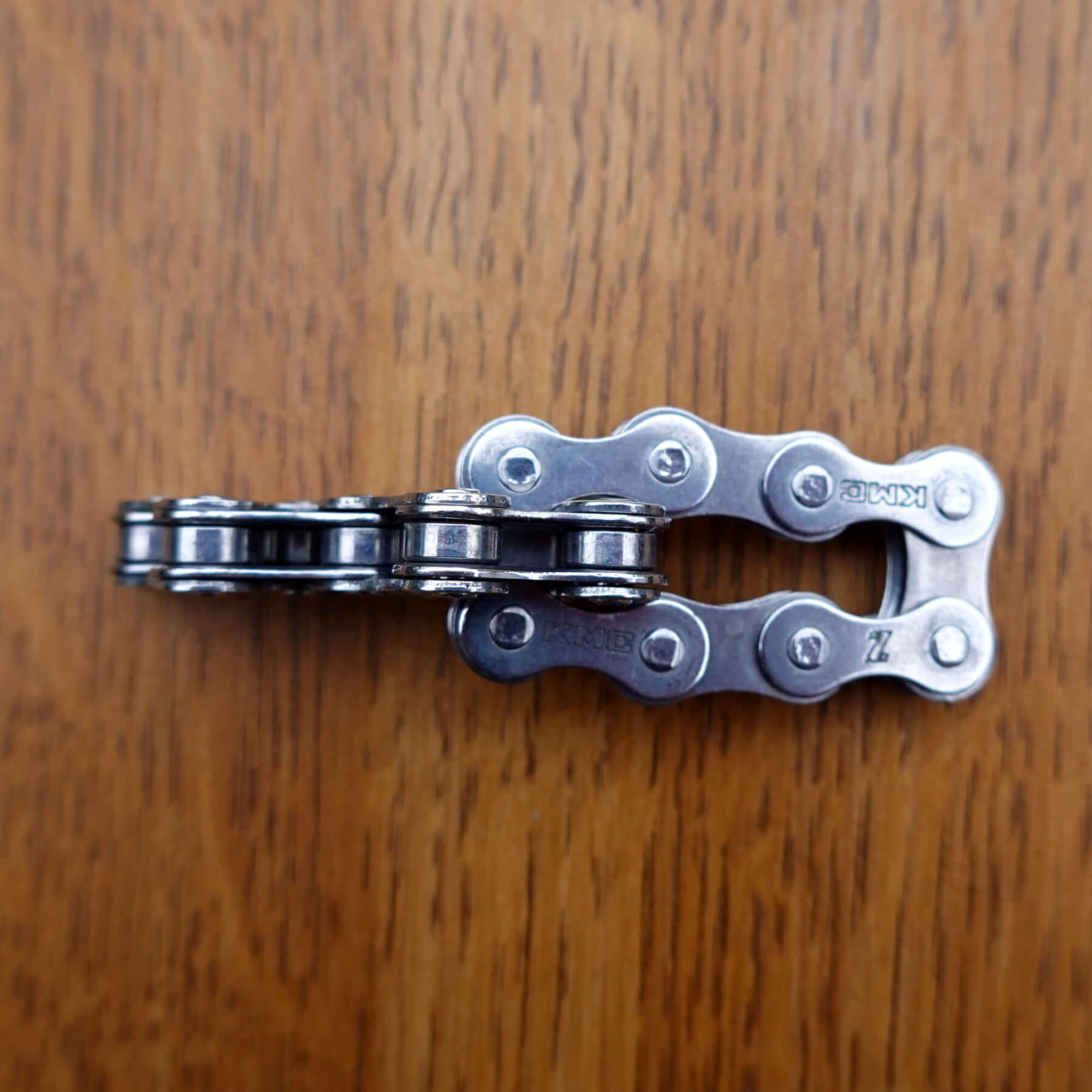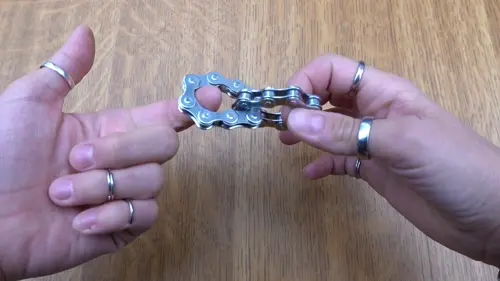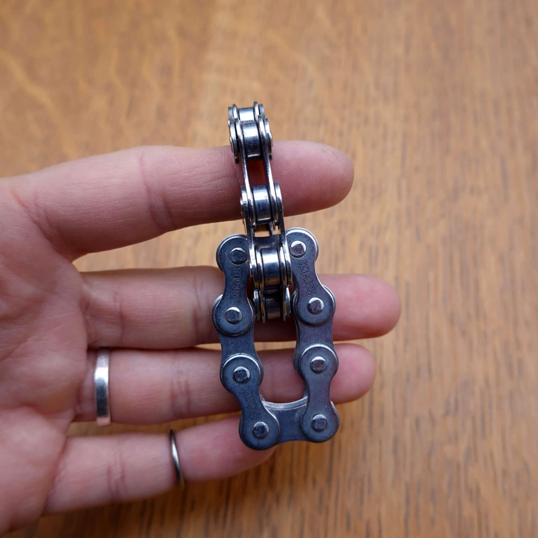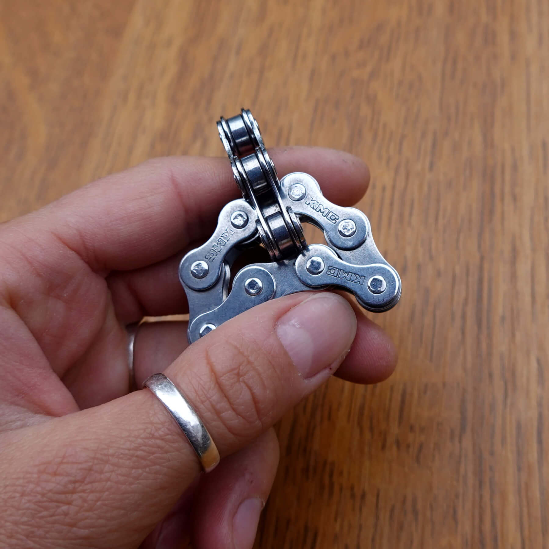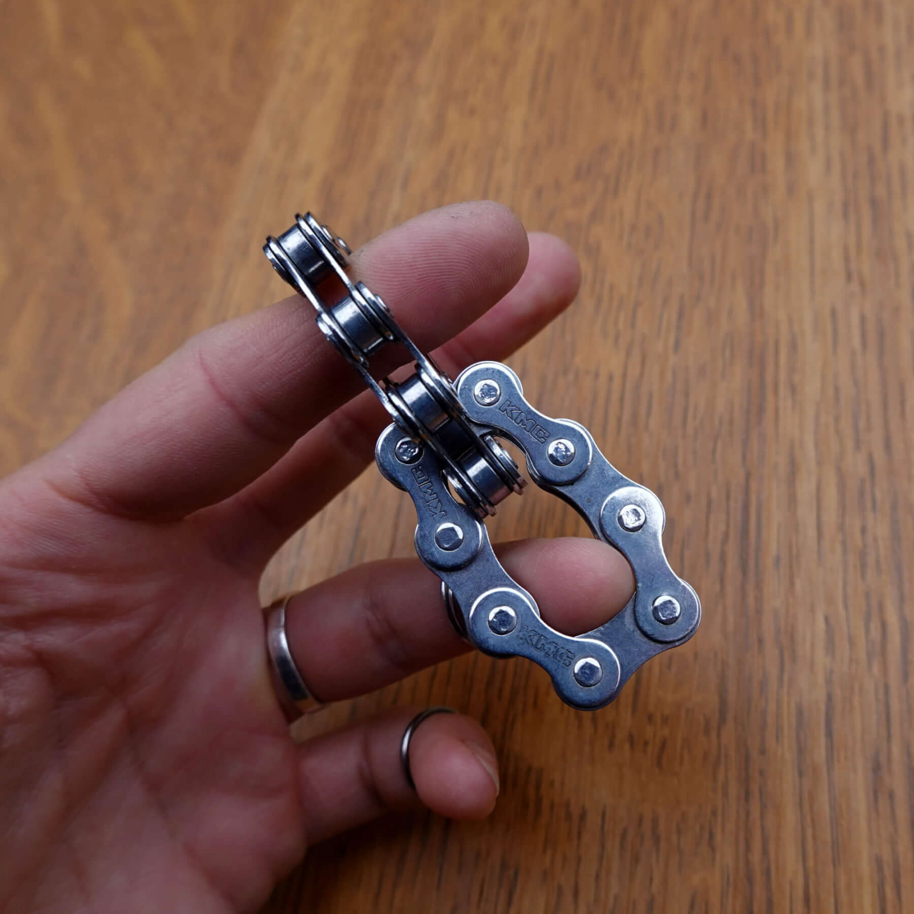 🖐️ Vous pouvez l’utiliser à une seule main en modulant chaque cercle de chaîne à souhait, en les faisant glisser et rouler autour de vos doigts ou encore en utilisant un des cercles comme un chapelet (du Dieu Vélo) et en le faisant avancer, maillon par maillon, à travers l’autre cercle. Il est également très agréable de le faire tourner autour d’un de ses doigts pour le rattraper après un tour au creux de sa main.