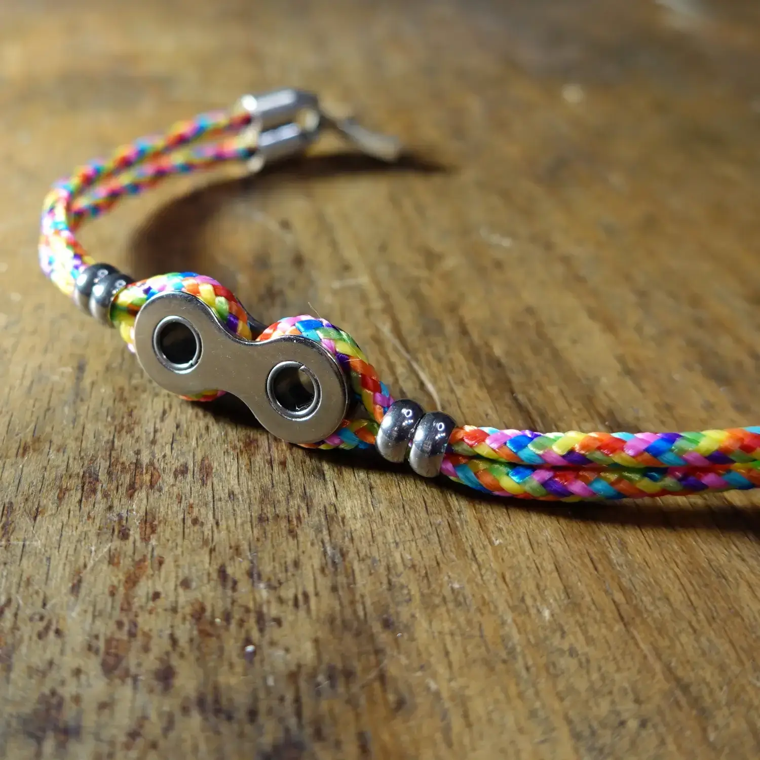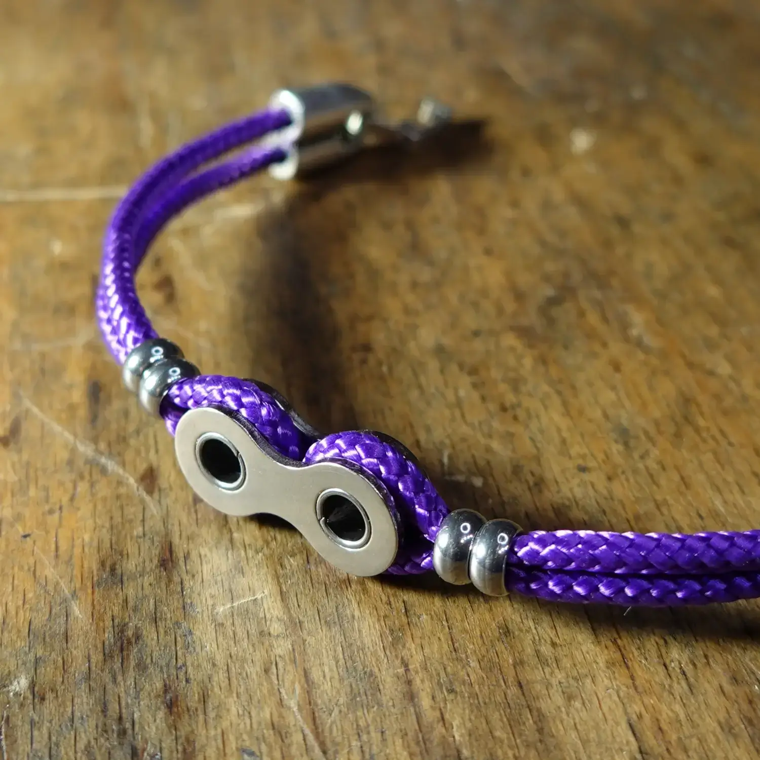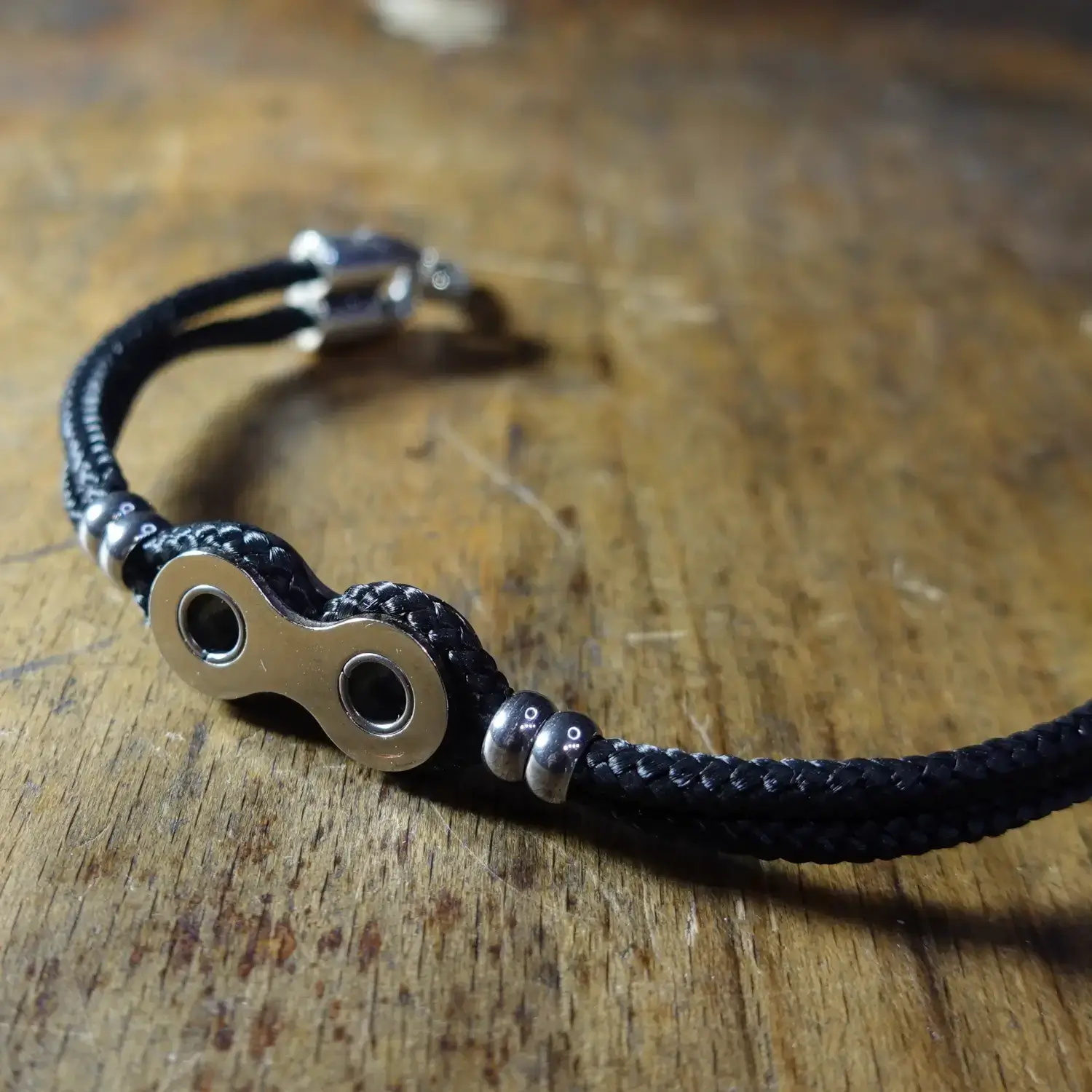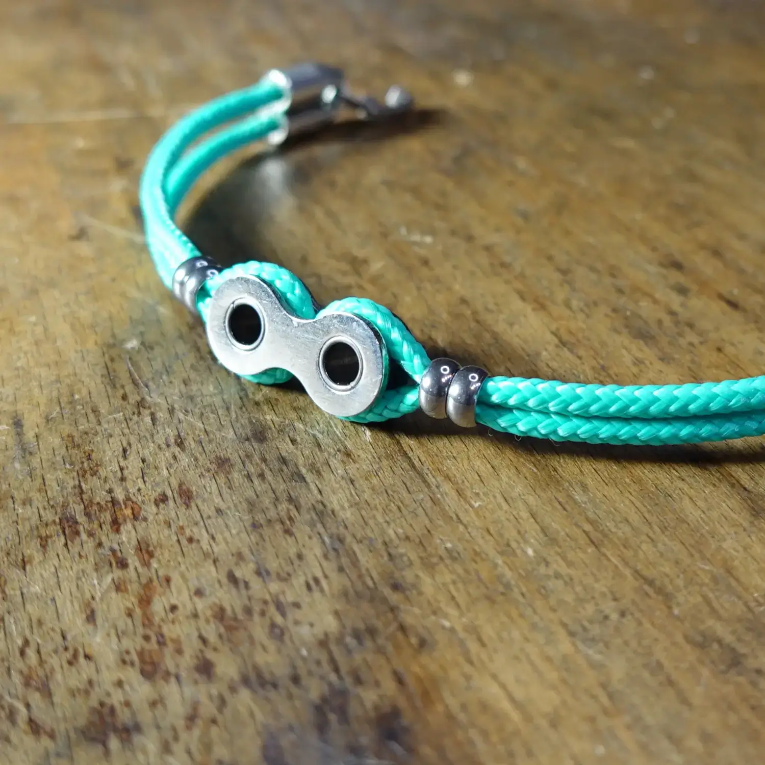 Chaque bracelet est fabriqué à la main à partir de maillons entiers de chaînes de vélo destinées au rebut, associés à de la paracorde résistante, 4 perles en acier inoxydable et un fermoir à clapet en zamak.