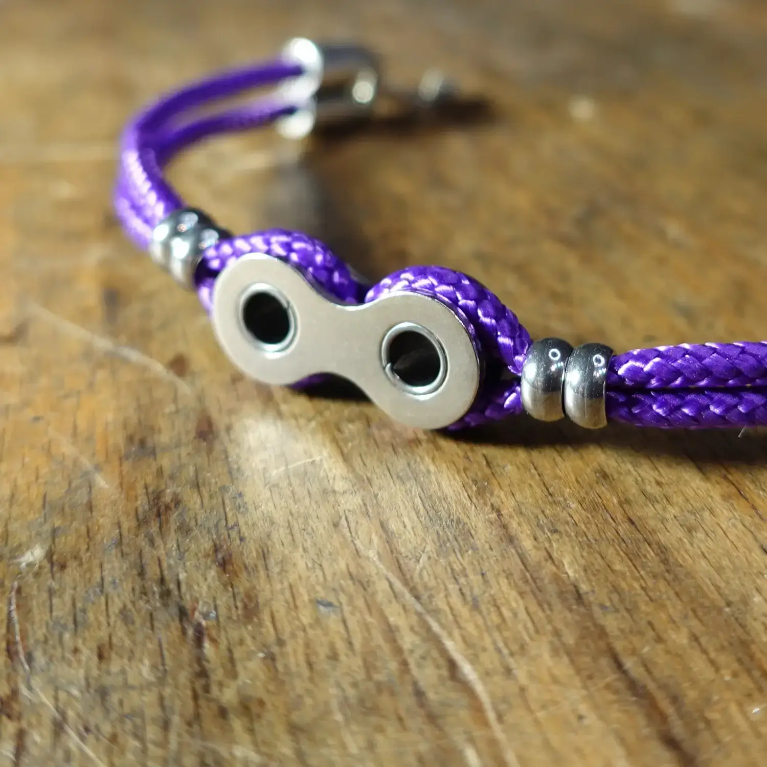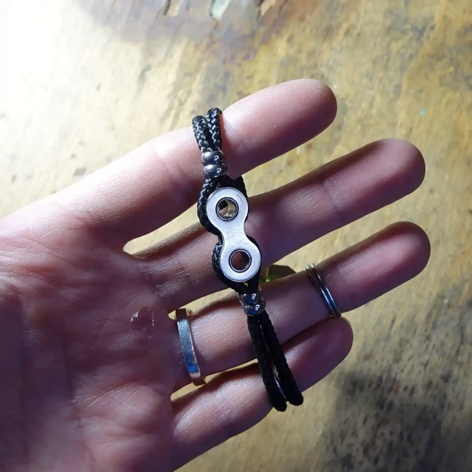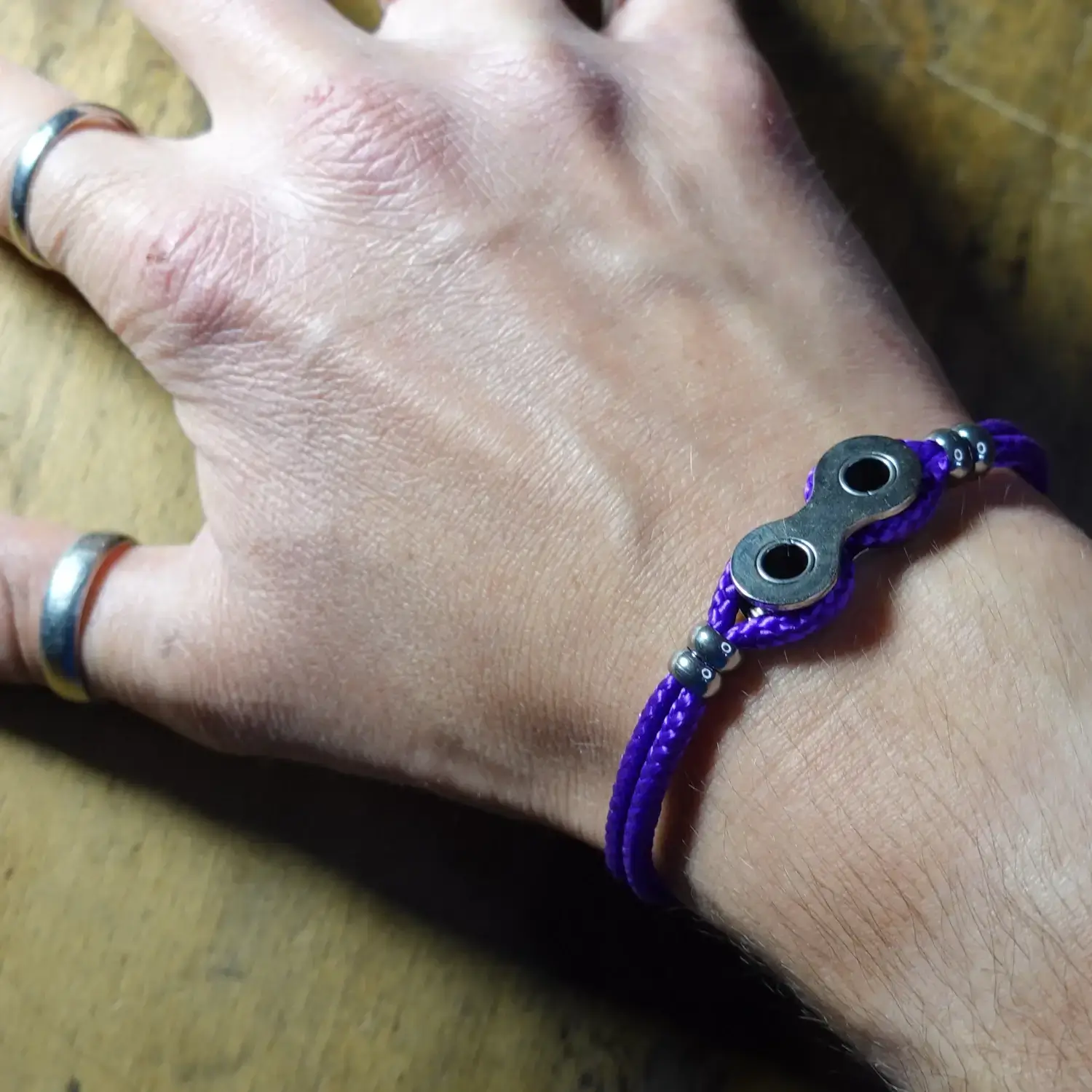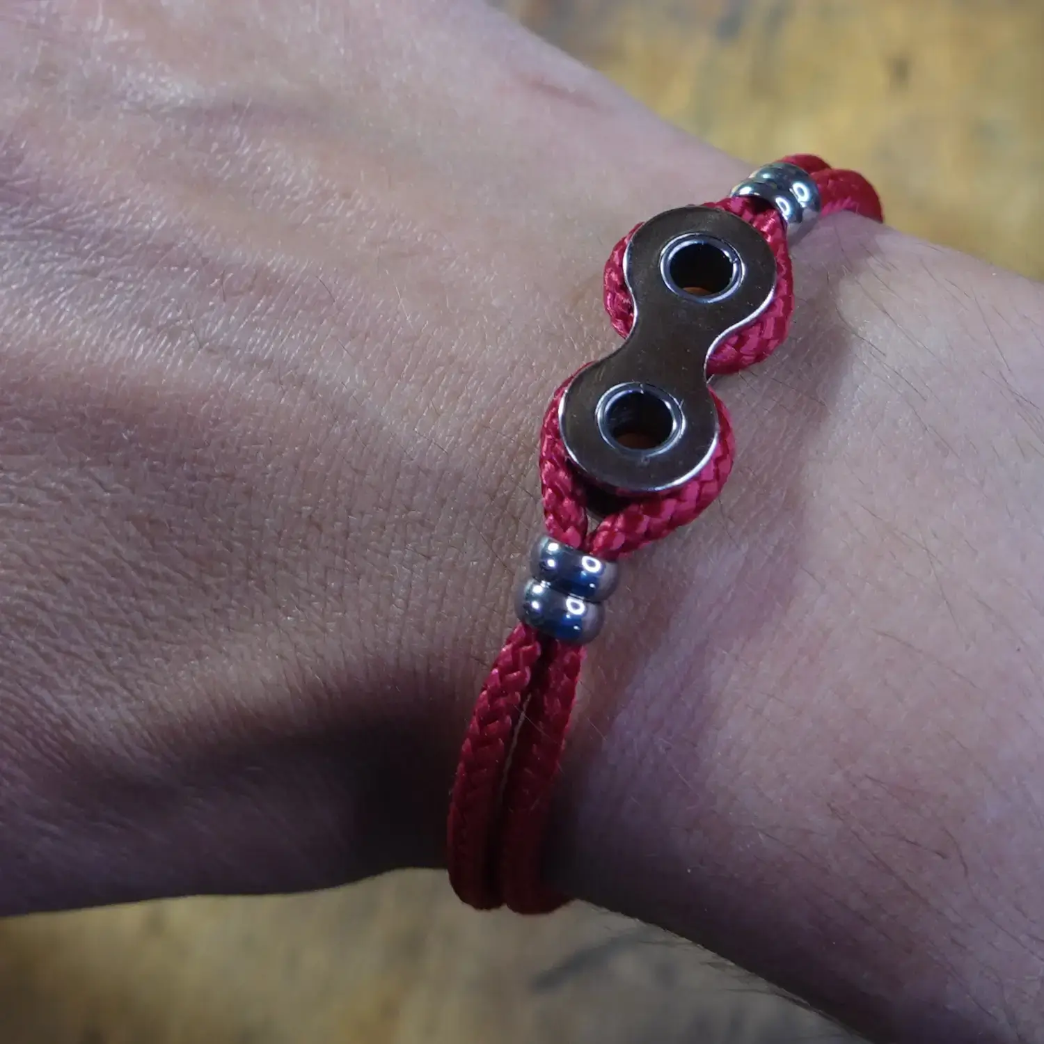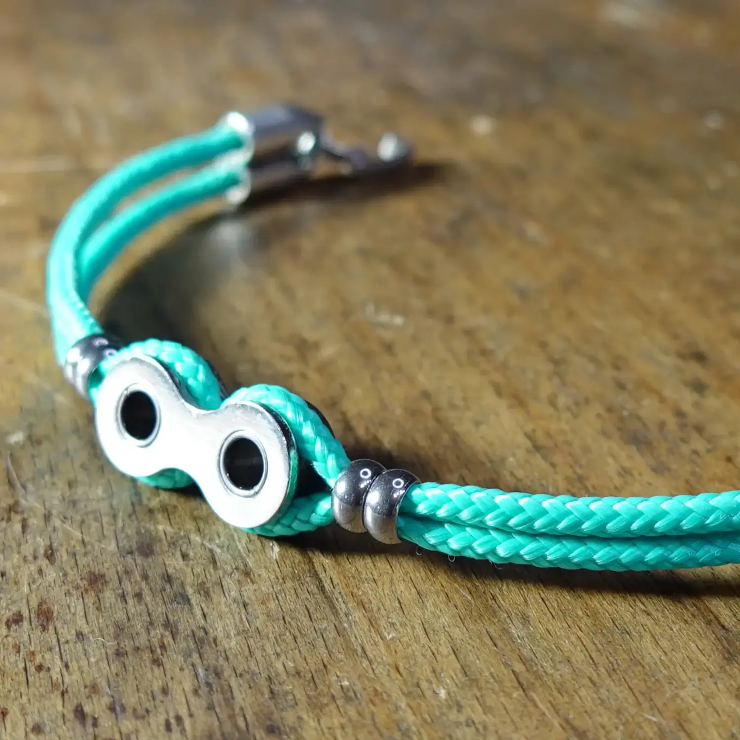 Chaque bracelet est fabriqué à la main à partir de maillons entiers de chaînes de vélo destinées au rebut, associés à de la paracorde résistante, 4 perles en acier inoxydable et un fermoir à clapet en zamak.