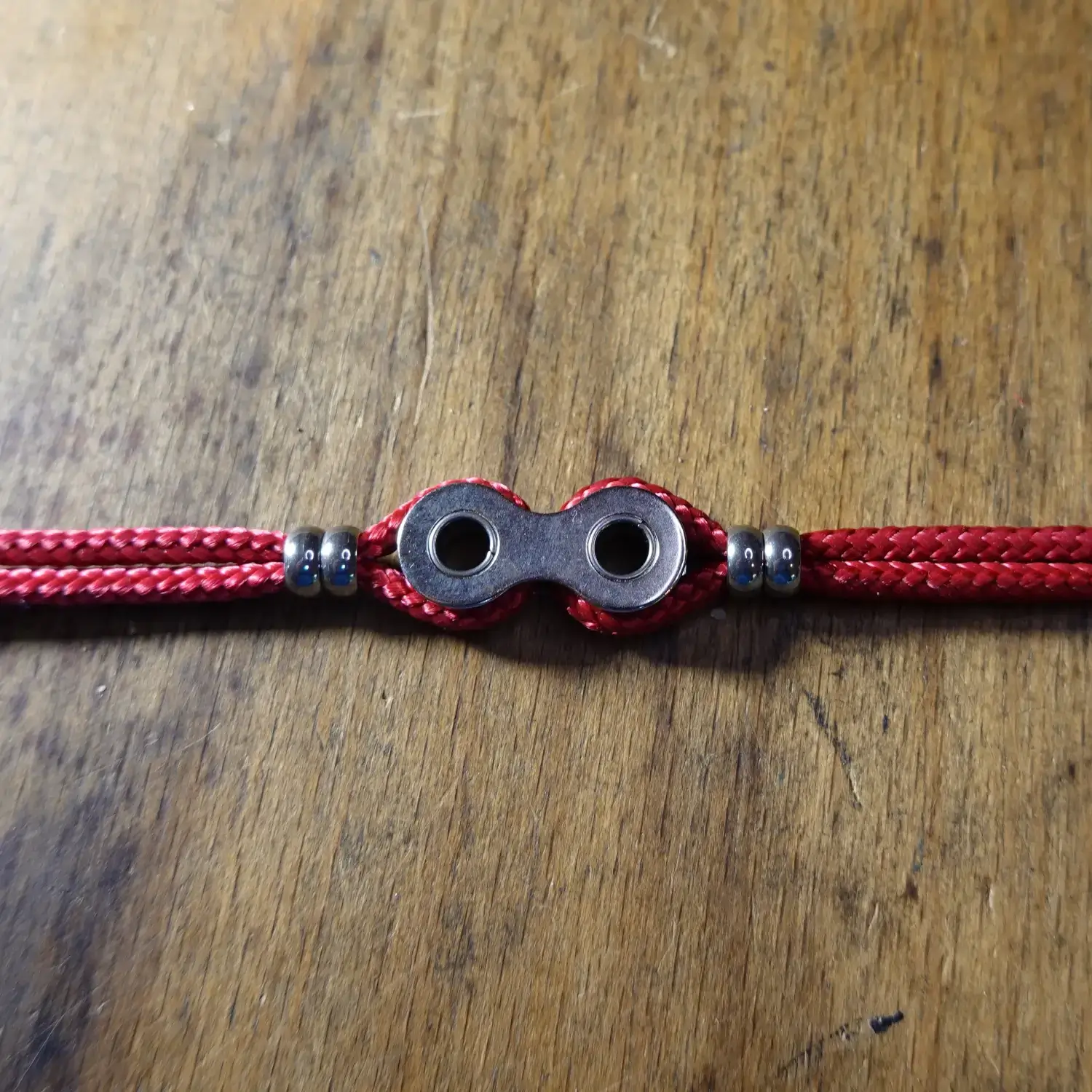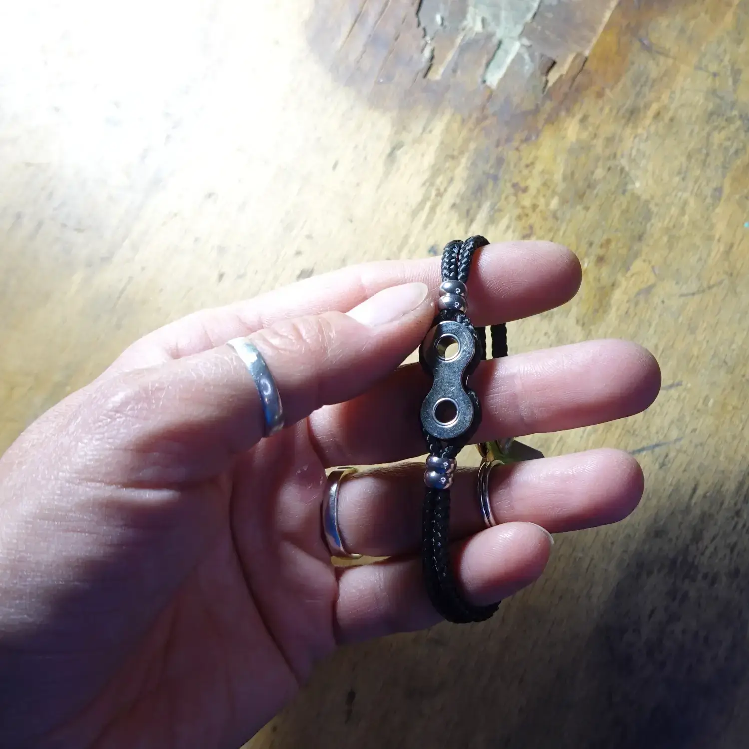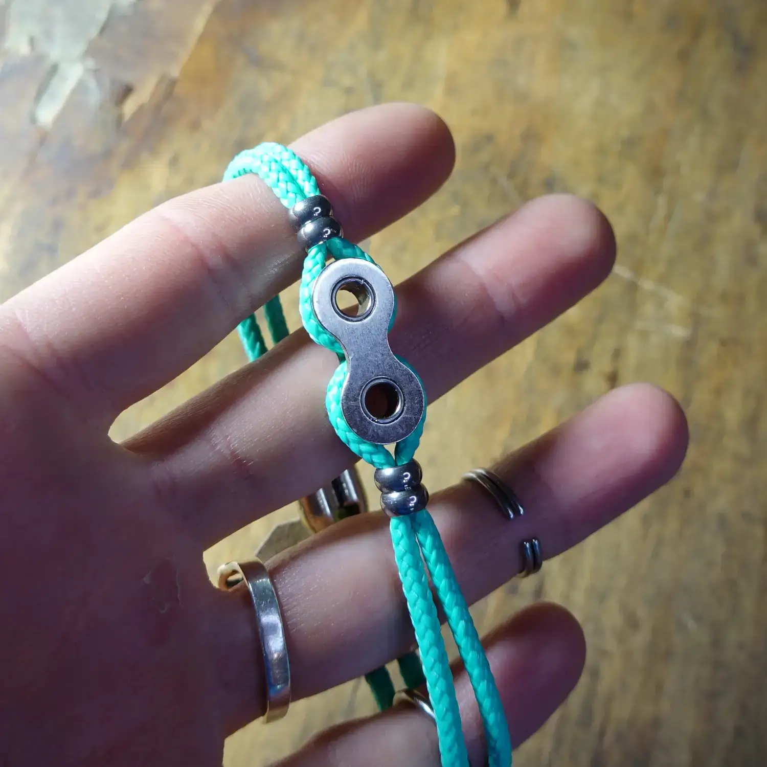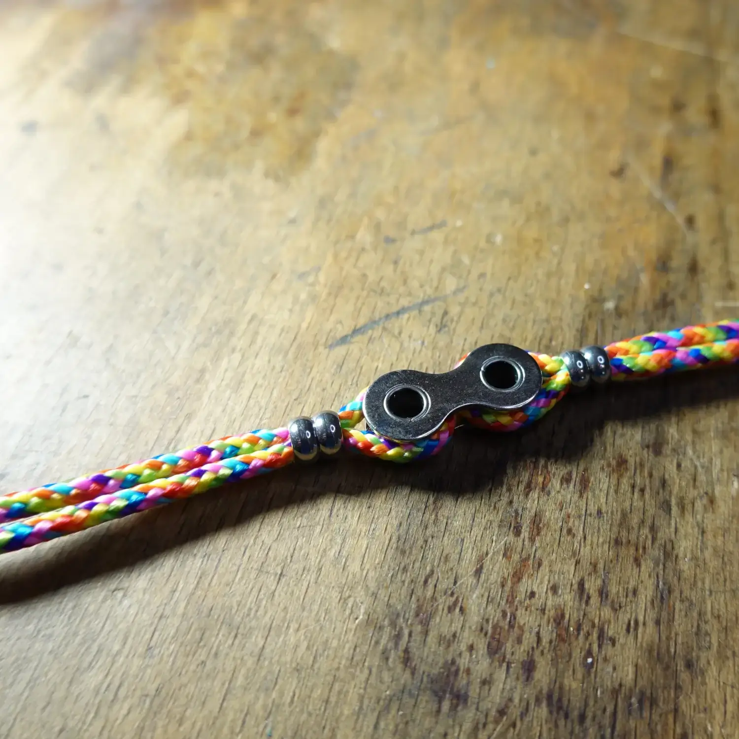 Chaque bracelet est fabriqué à la main à partir de maillons entiers de chaînes de vélo destinées au rebut, associés à de la paracorde résistante, 4 perles en acier inoxydable et un fermoir à clapet en zamak.