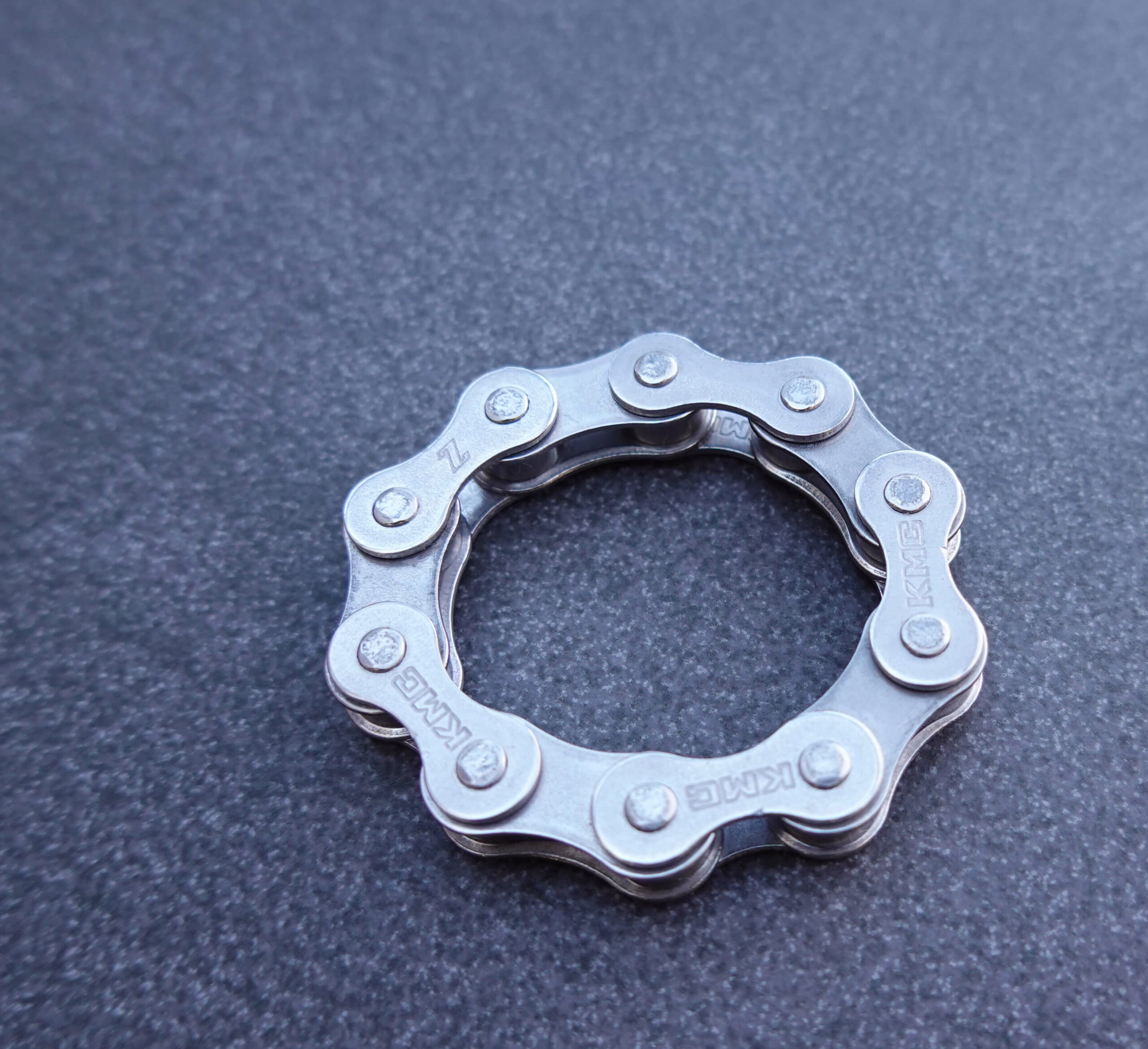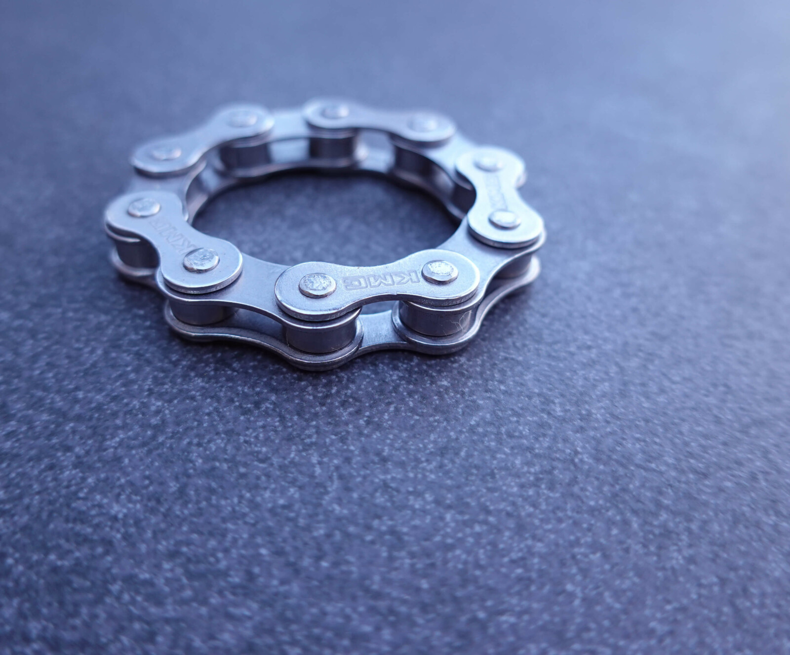 Les chaînes de vélo 🚲 (chaînes usées et bouts de chaînes en trop inutilisés) sont démontées, nettoyées minutieusement (grossièrement au chiffon une première fois, puis aux ultra-sons 🎛️, et enfin re-nettoyées à la main avec de l’eau très chaude 🚿, du savon 🧼 et une brosse 🪥) et assemblées en cercle de 6, 8 ou 10 maillons.