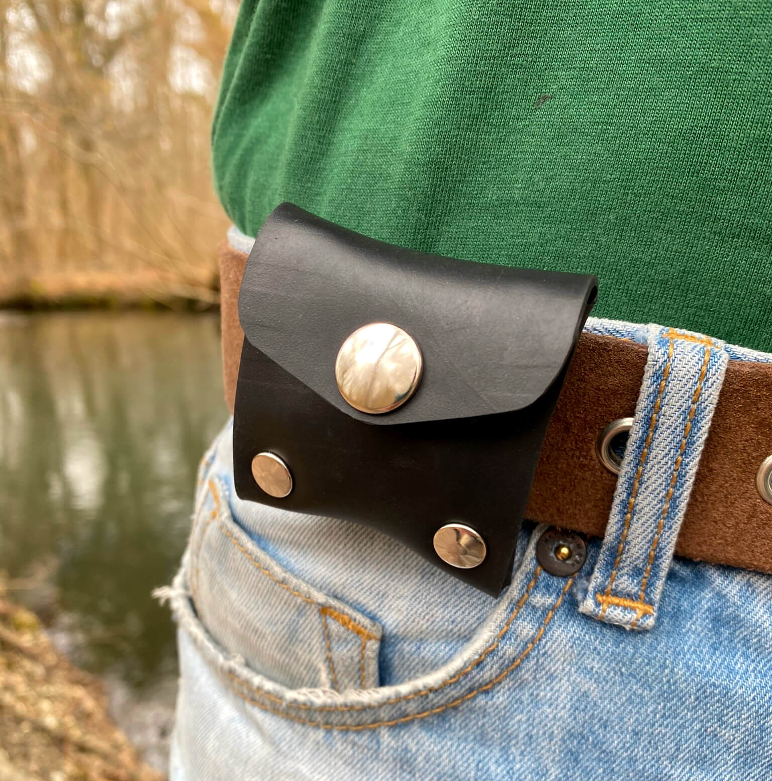 La pochette se passe dans n’importe quelle ceinture de moins de 3,3cm de largeur.
