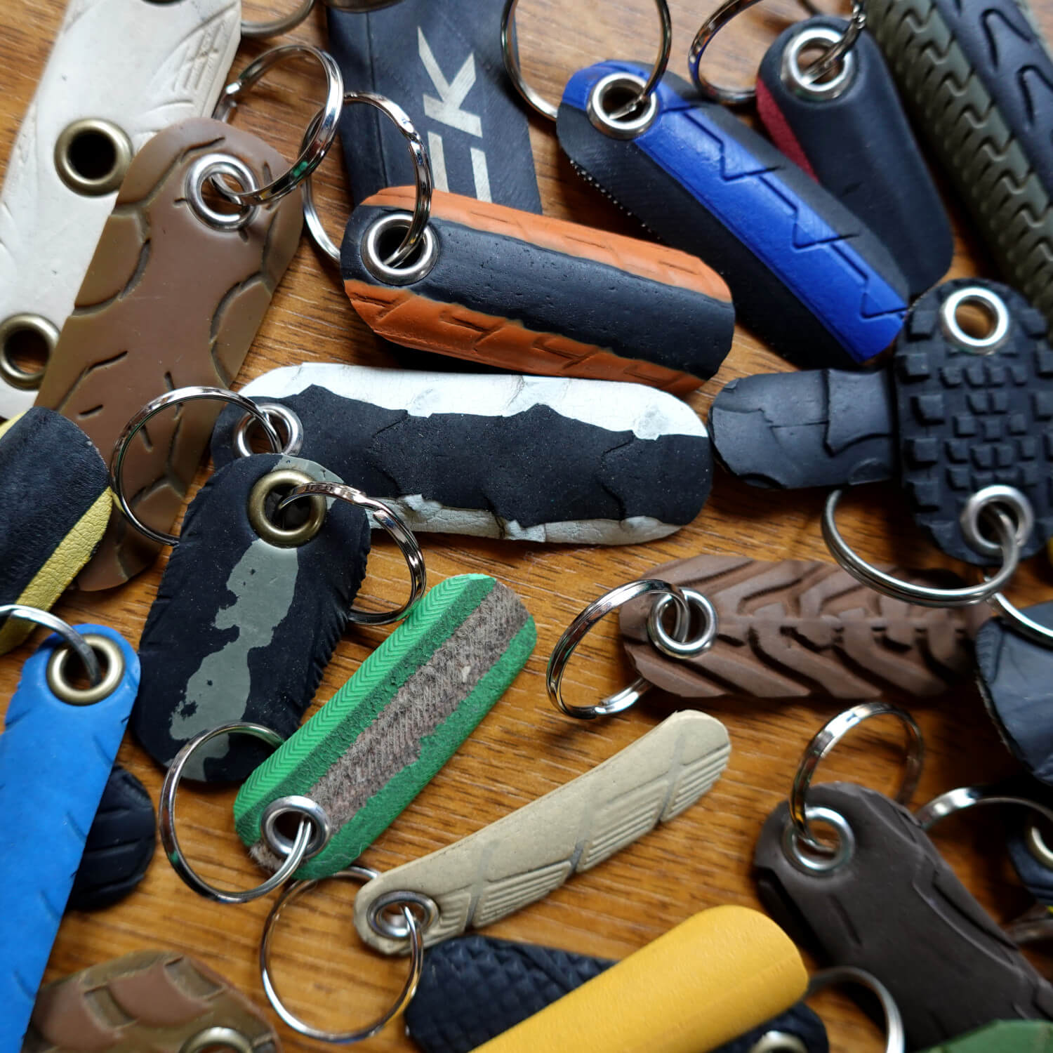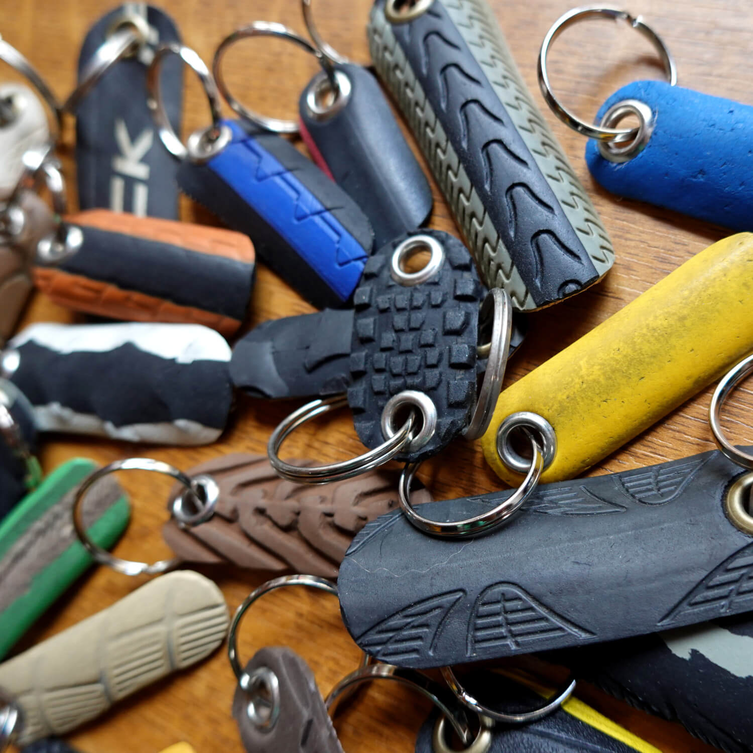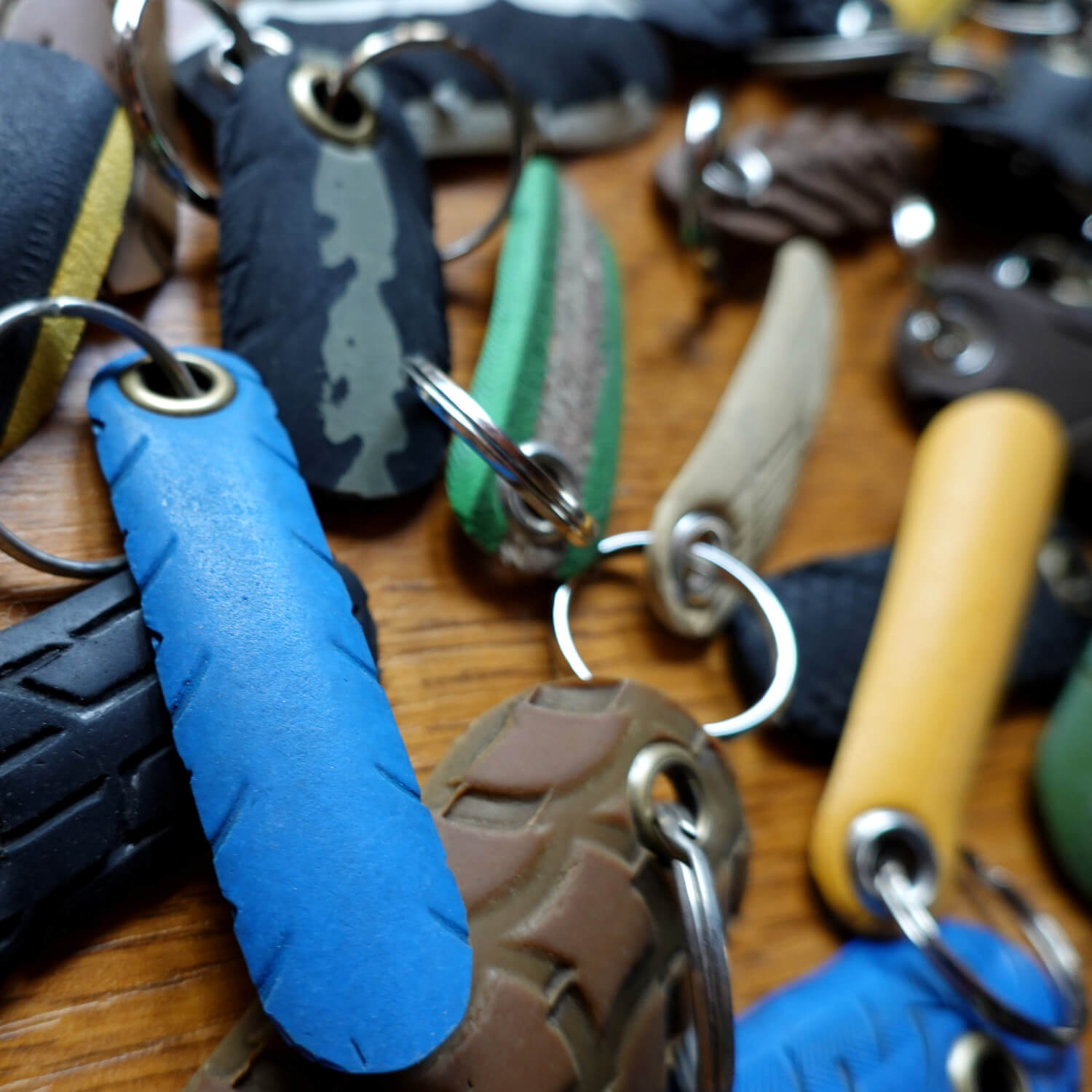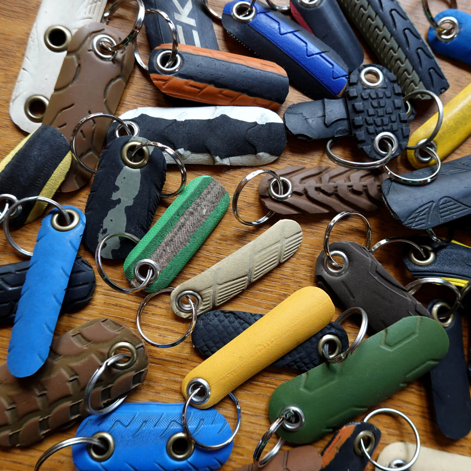 Porte-clés fabriqués à partir de pneus de vélo usagés.