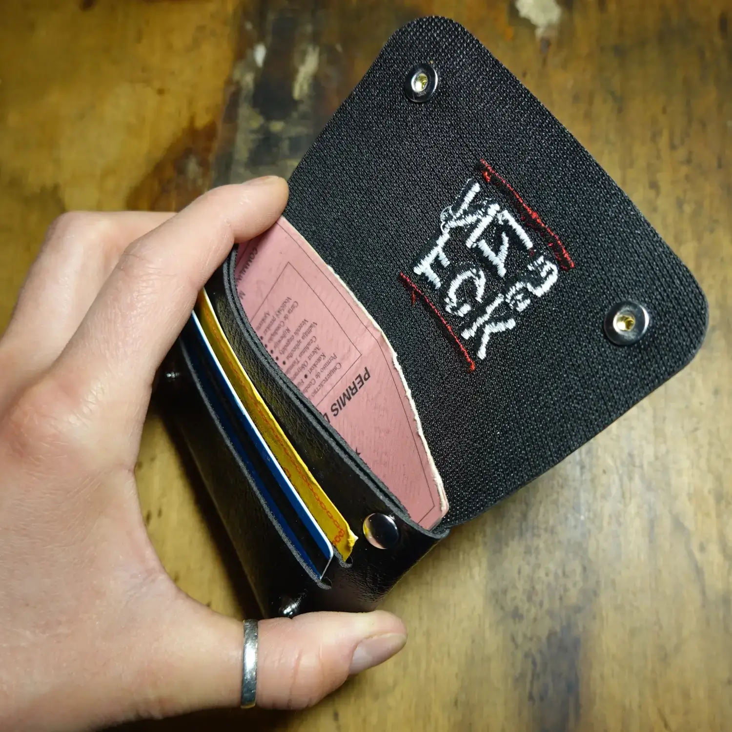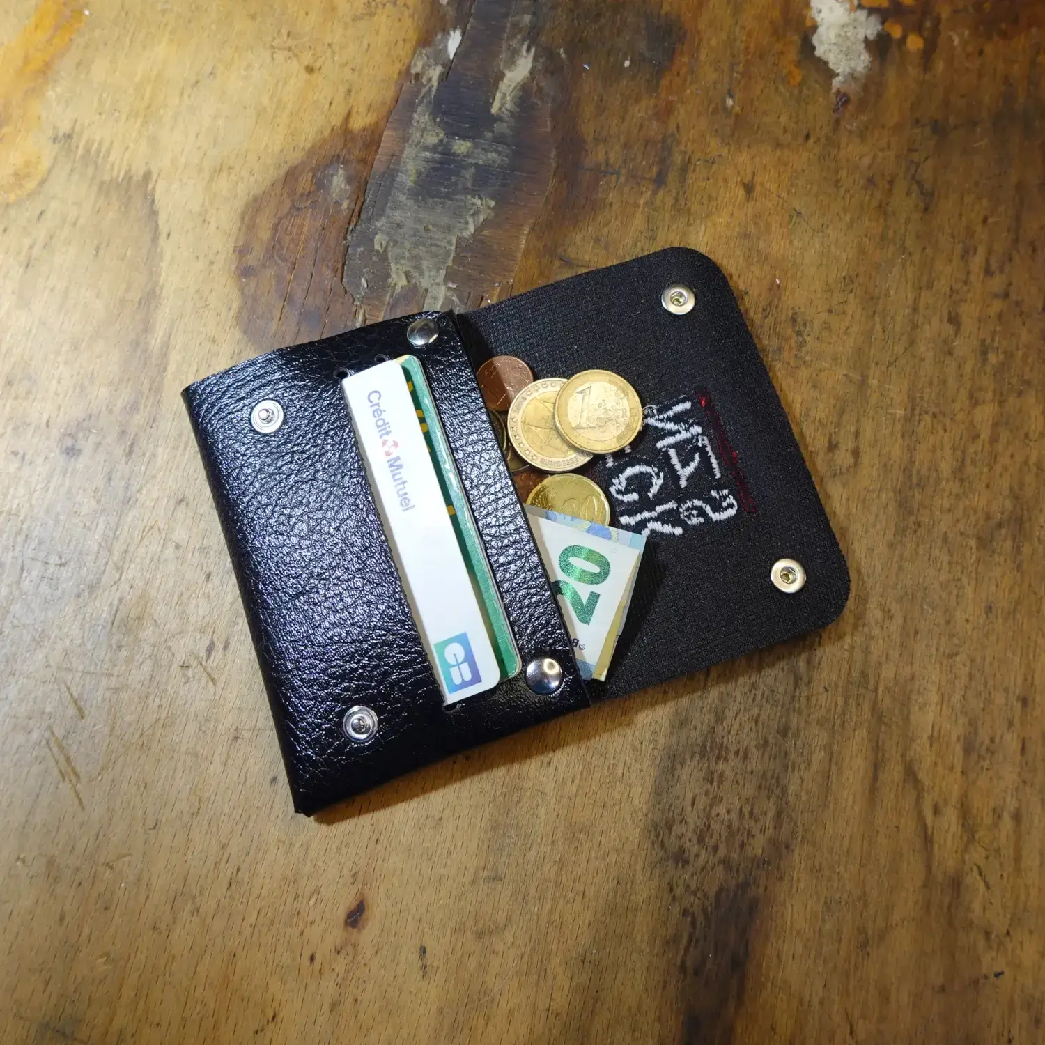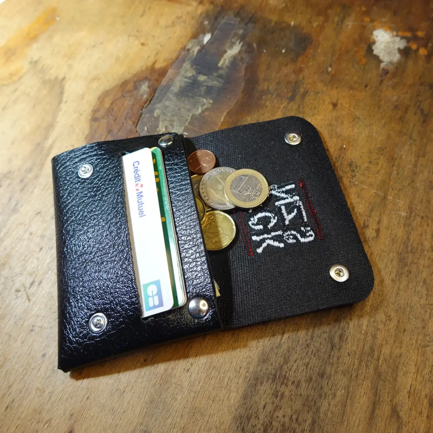 Portefeuille minimaliste réalisé à partir d’un tablier de scooter upcyclé, broderie logo FCK NZS ✊. 2 emplacements cartes & compartiment pièces + billets